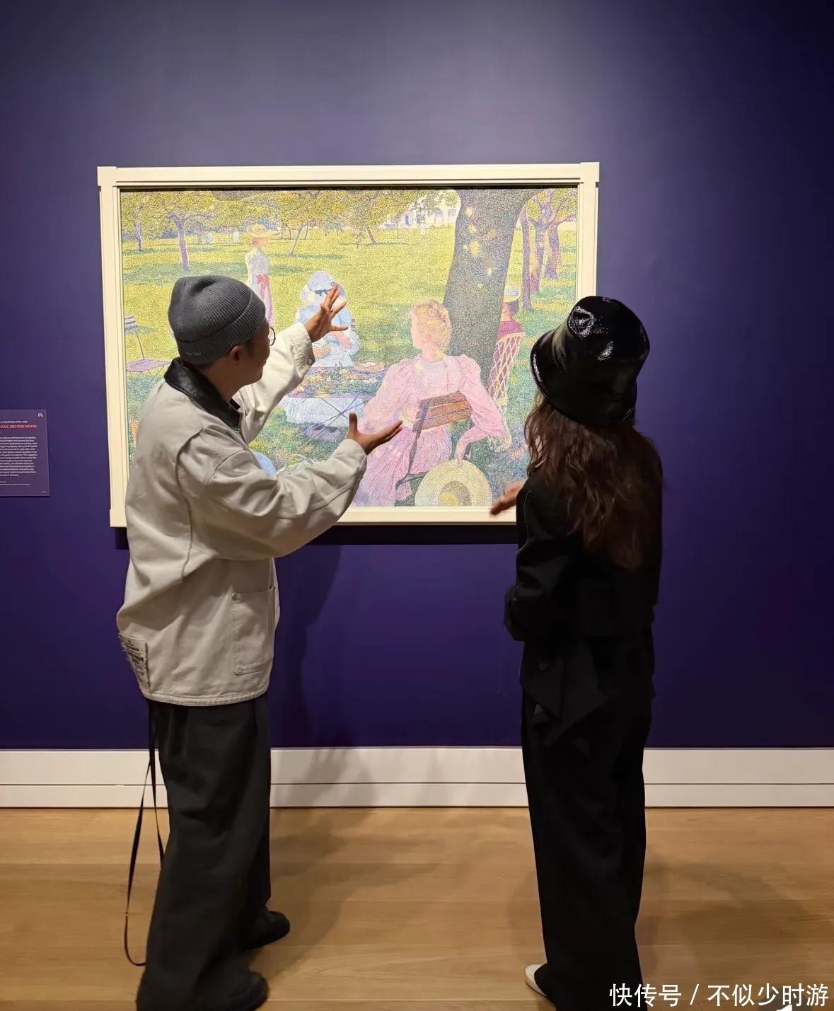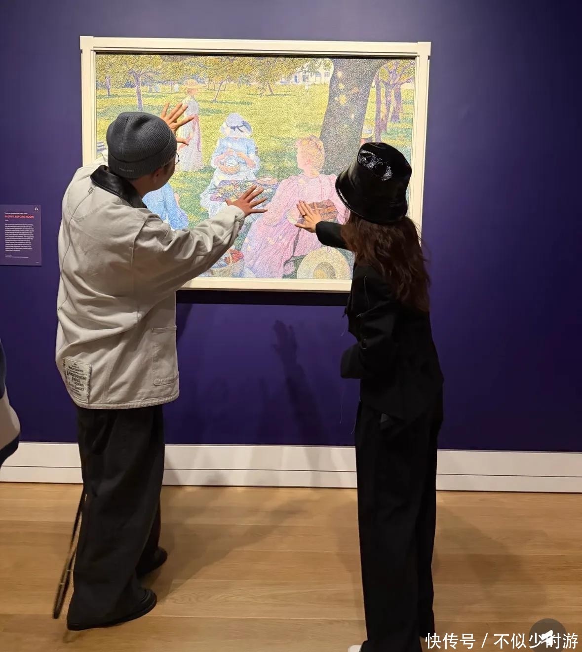 两人并肩欣赏展品时氛围轻松自然,互动频繁。他们拍摄了多张合影,画面中的章泽天笑容灿烂,毫不拘束,眉眼间满是愉悦。她的自信与生命力扑面而来,举手投足间散发出一种由内而外的丰盈感,极具感染力。